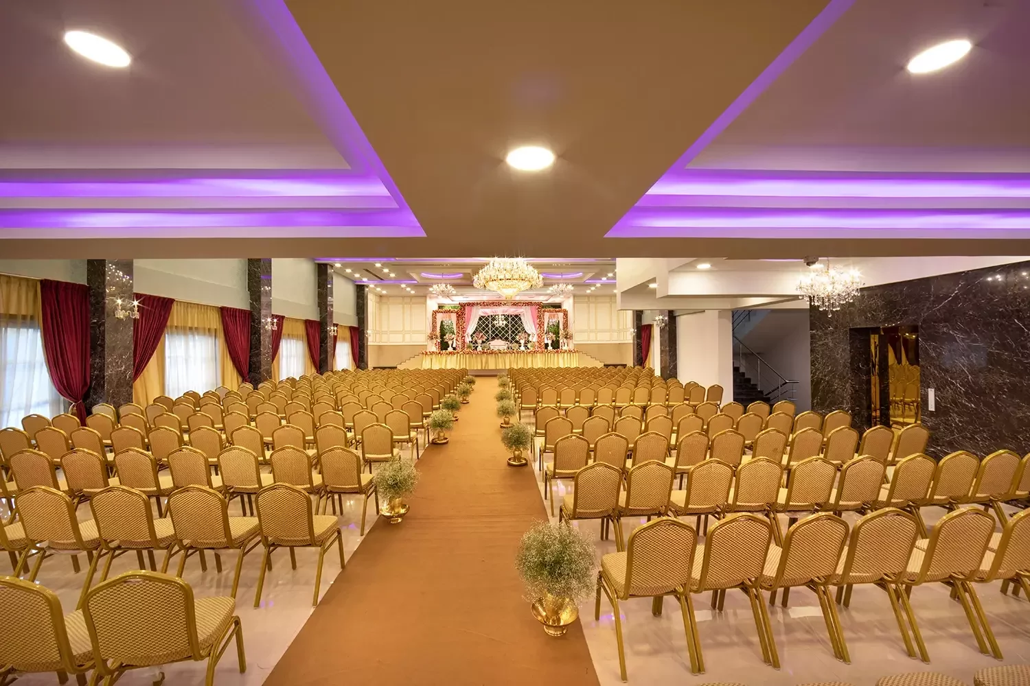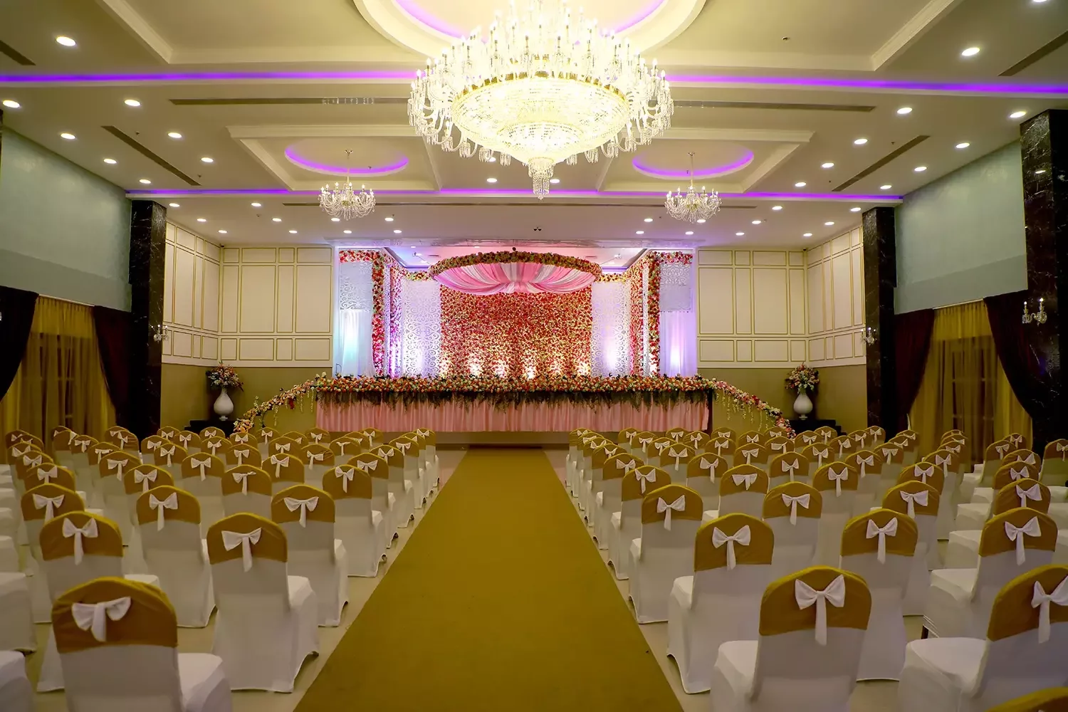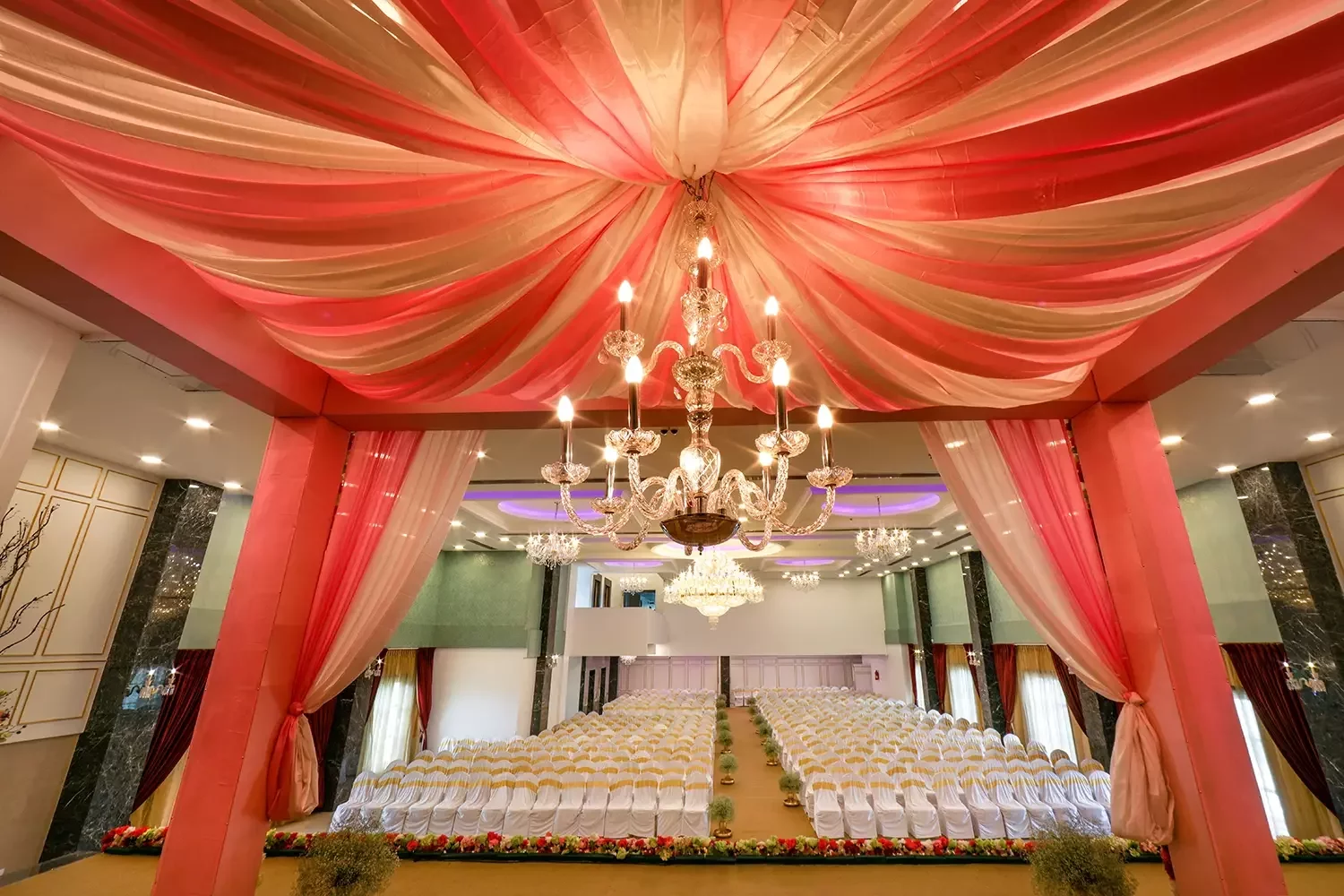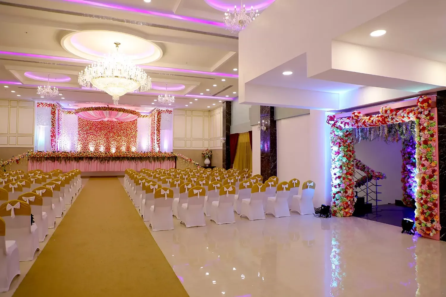 Our latest and largest hall is a sight to behold! From crystal-studded chandeliers to custom mood lighting The Ballroom at Risa was created to make all your wedding dreams come true. The spacious interiors and rich detailing take celebrations to new royal heights. The design elements were created to provide a luxurious experience, all while ensuring that practicalities and modern sensibilities were paramount.